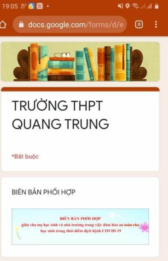 Trường THPT Quang Trung thông báo đến toàn thể quý phụ huynh nội dung “Biên bản phối hợp giữa cha mẹ học sinh và nhà trường thong việc đảm bảo an toàn cho học sinh trong thời điểm dịch bệnh COVID -19 “. Để kí cam kết online mời quý phụ huynh bấm và nhập theo hướng dẫn đường Link dưới đây: