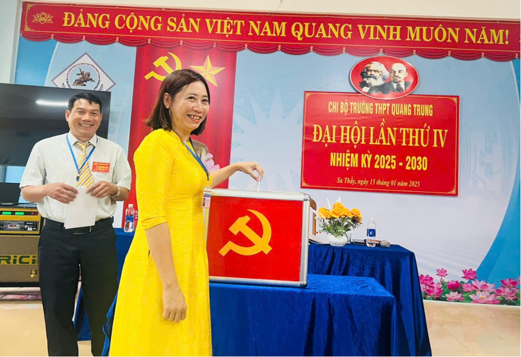 Đại hội đã tiến hành bầu cử và thông qua kết quả bầu vào Chi ủy chi bộ trường THPT Quang Trung nhiệm kỳ 2025-2030 gồm 03 đồng chí: Cao Thị Hoài Hương, Huỳnh Duy Huấn, Hồ Xuân Vương. Đại hội bầu ra Bí thư Chi bộ (đ/c chí Cao Thị Hoài Hương), Phó Bí thư Chi bộ (đ/c Huỳnh Duy Huấn) bầu Bầu đại biểu đi dự đại hội Đảng bộ huyện lần thứ XVIII gồm 03 đại biểu chính thức (đ/c Cao Thị Hoài Hương, Huỳnh Duy Huấn, Hồ Xuân Vương) và 01 đại biểu dự khuyết (đ/c Nguyễn Thị Minh Phú).