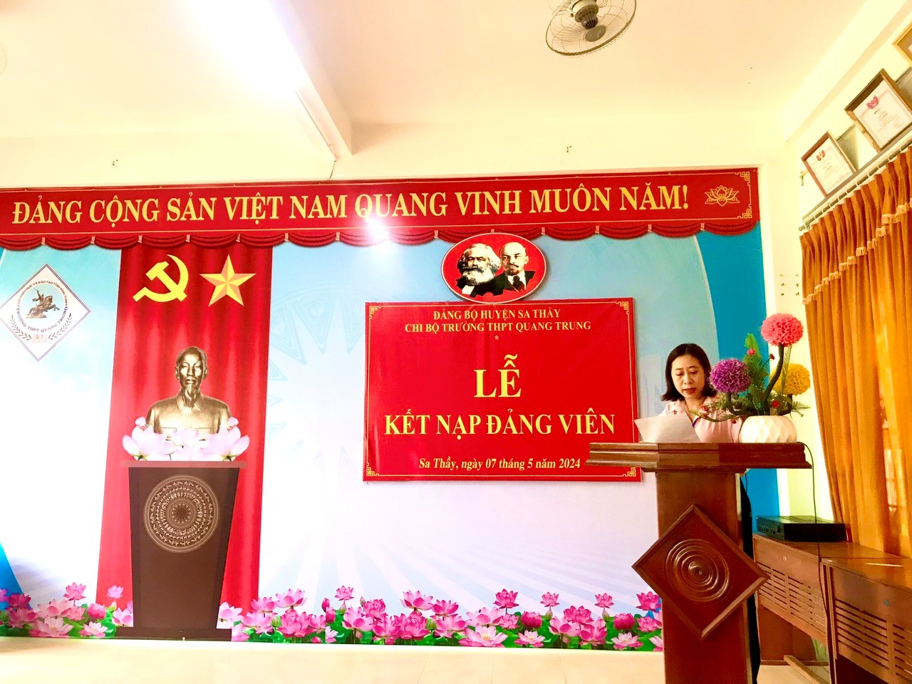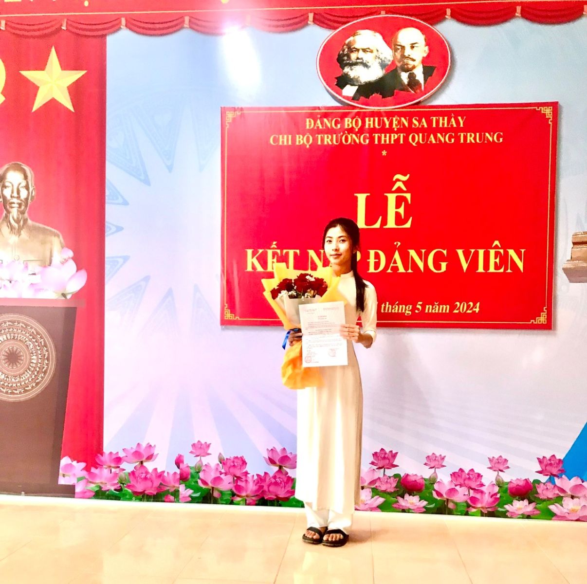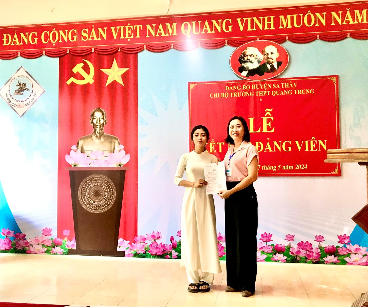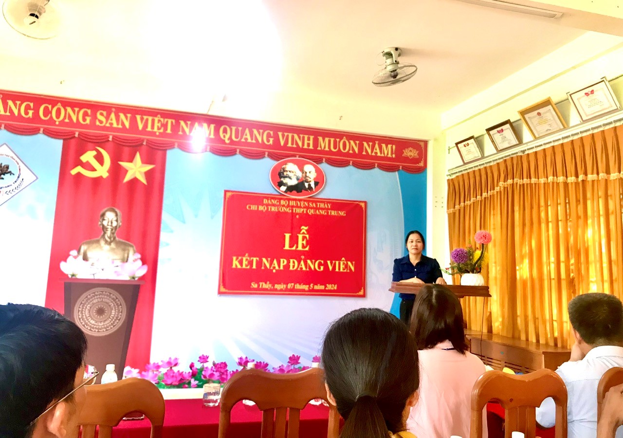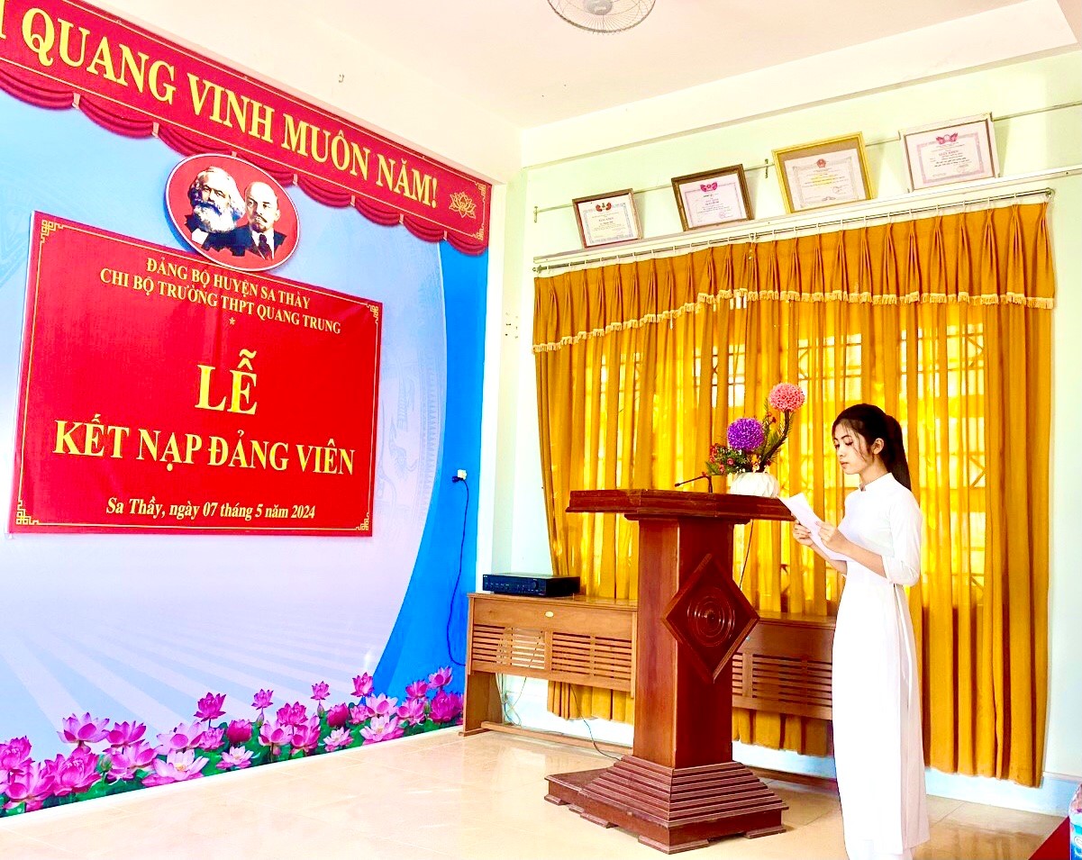 Chiều ngày 07/5/2024, Chi bộ trường THPT Quang Trung đã tổ chức Lễ kết nạp đảng viên cho quần chúng Nguyễn Thị Thùy Trang, hiện đang là học sinh lớp 12A1 của nhà trường. Tham dự buổi lễ có sự hiện diện của đồng chí Tống Thị Nghĩa – Ủy viên Ban Thường vụ, Trưởng Ban tổ chức Huyện ủy Sa Thầy cùng toàn thể 17 đồng chí đảng viên trong Chi bộ trường THPT Quang Trung.