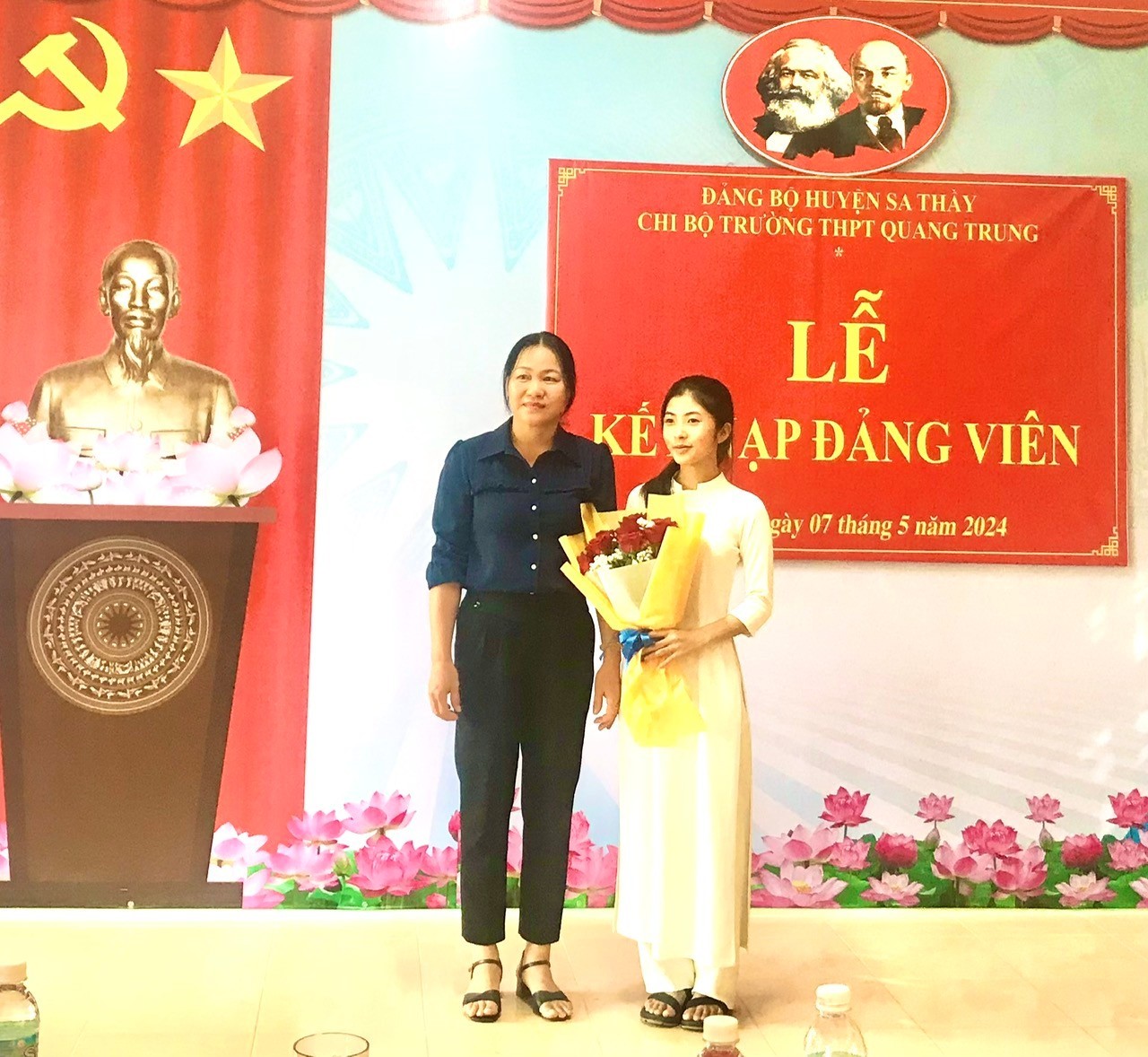 Đ/c Tống Thị Nghĩa – Trưởng ban tổ chức Huyện ủy Sa Thầy; đ/c Cao Thị Hoài Hương – Bí thư Chi bộ trường THPT Quang Trung chụp hình lưu niệm cùng đ/c Đảng viên mới